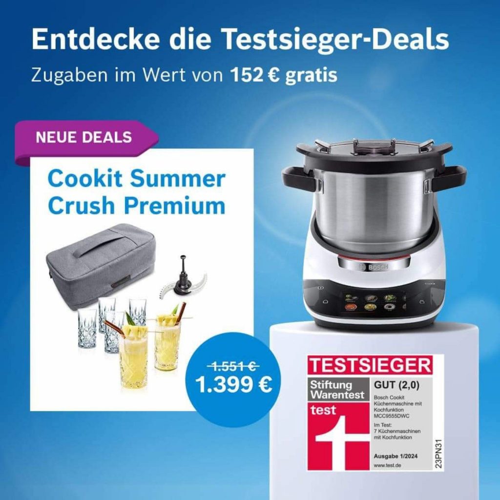 Erhalte bei mir mit dem All In Premium Deal : ein Crushmesser, 3 Schneid-/ Reibescheiben, einen zweiten 3L-XL-Topf inkl. Deckel, die Lifter Umfüllhilfe und die Zubehörtasche gratis. Sicher dir das größte Cookit Angebot aller Zeiten und spare dabei 379 € im Vergleich zum Einzelkauf. Heißer wird’s nicht!